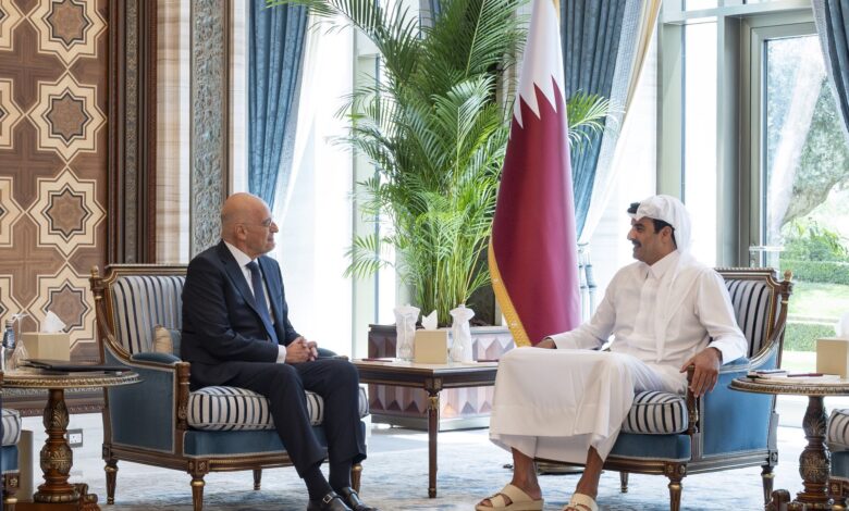 وقال الديوان الأميري القطري في بيان إن مباحثات لقاء أمير قطر بالوزير اليوناني في الدوحة تركزت على تداعيات تطورات الأوضاع في المنطقة على الأمن والاستقرار إقليميا ودوليا إلى جانب الجهود الدولية المبذولة لاحتواء التوترات وخفض التصعيد والدفع بالحلول الدبلوماسية.
