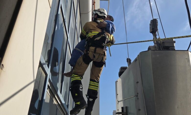 «الإطفاء» تعاملت مع بلاغ تعطل و انحشار عامل داخل رافعة صيانة في مبنى بمنطقة المرقاب