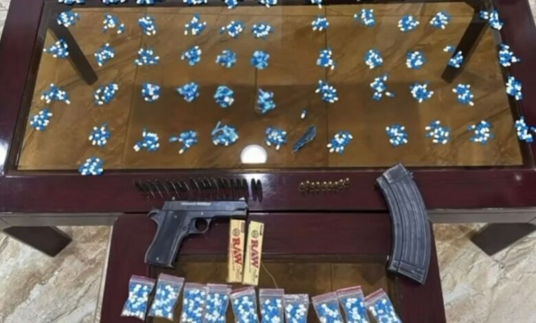 منتسبي الوزارة وبتفتيش المركبة احترازياً عُثر بداخلها على كمية من الحبوب يُشتبه بأنها مخدّرة من نوع «ليريكا» وقطعة من مادة الحشيش وأدوات يُشتبه استخدامها في التعاطي وسلاح ناري نوع (9) ملم) وعدد من الطلقات ومخزن سلاح وذخيرة متنوعة.