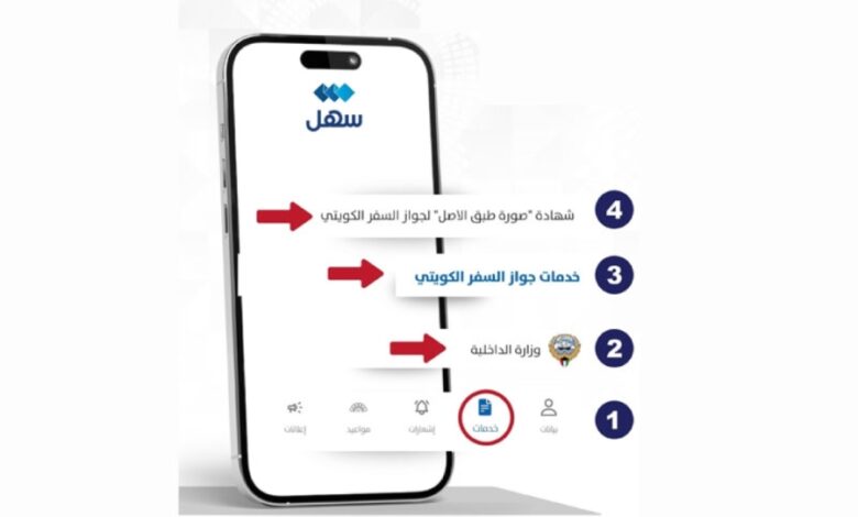 وذكرت (الداخلية) في بيان صحفي اليوم الأحد أن خطوات طلب الشهادة هي الدخول إلى خدمات الوزارة في تطبيق (سهل) واختيار خدمات جواز السفر الكويتي ثم اختيار خدمة (شهادة صورة طبق الأصل لجواز السفر الكويتي).