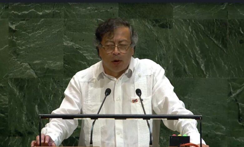 وفي خطابٍ قوي خلال جلسة الجمعية العامة للأمم المتحدة، قال بيترو: “إنهم لا يقصفون غـ ـزة فقط، بل يهددوننا جميعًا”، محمّلاً الولايات المتحدة المسؤولية عن ما وصفه بـ “هذا التوحش”، وفقاً لتعبيره.