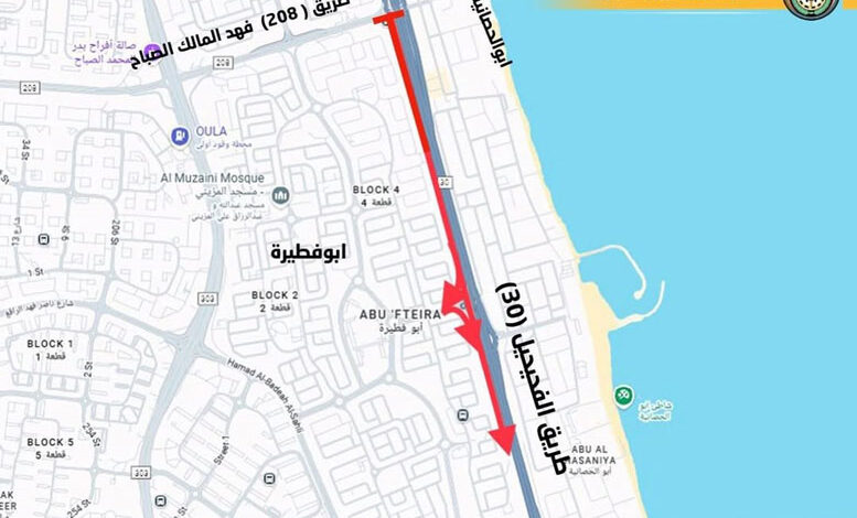 أعلنت الإدارة العامة للمرور عن إغلاق حارة الأمان والمسار الأيمن البطيء ونصف المسار الأوسط، مع إغلاق مدخل ومخرج منطقة ابوفطيرة المؤدي إلى طريق الملك عبدالعزيز بن عبدالرحمن آل سعود ( الفحيحيل – 30 )، من جسر أبو الحصانية وأبو فطيرة حتى قبل دوار العقيلة والفنطاس بإتجاه الجنوب، وذلك أعتباراً من مساء يوم الجمعة الموافق 2025/11/14 وحتى يوم الجمعة الموافق 2025/11/28 ، مع فتح الحارة السريعة على نفس الطريق.