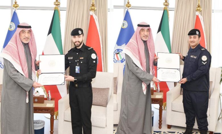 وذكرت وزارة الداخلية في بيان صحفي أن التكريم شمل وكيل العريف محمد المطيري وذلك لضبطه محاولة خروج شخص من البلاد بطريقة غير مشروعة من منفذ (النويصيب) ووكيل ضابط يوسف الرشيدي لضبطه جواز سفر أجنبي مزورا في مطار الكويت الدولي.
